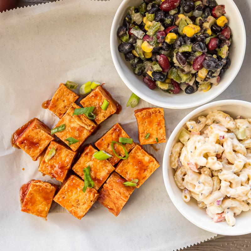 Lightly fried tofu topped with our house BBQ sauce with choice of two sides.