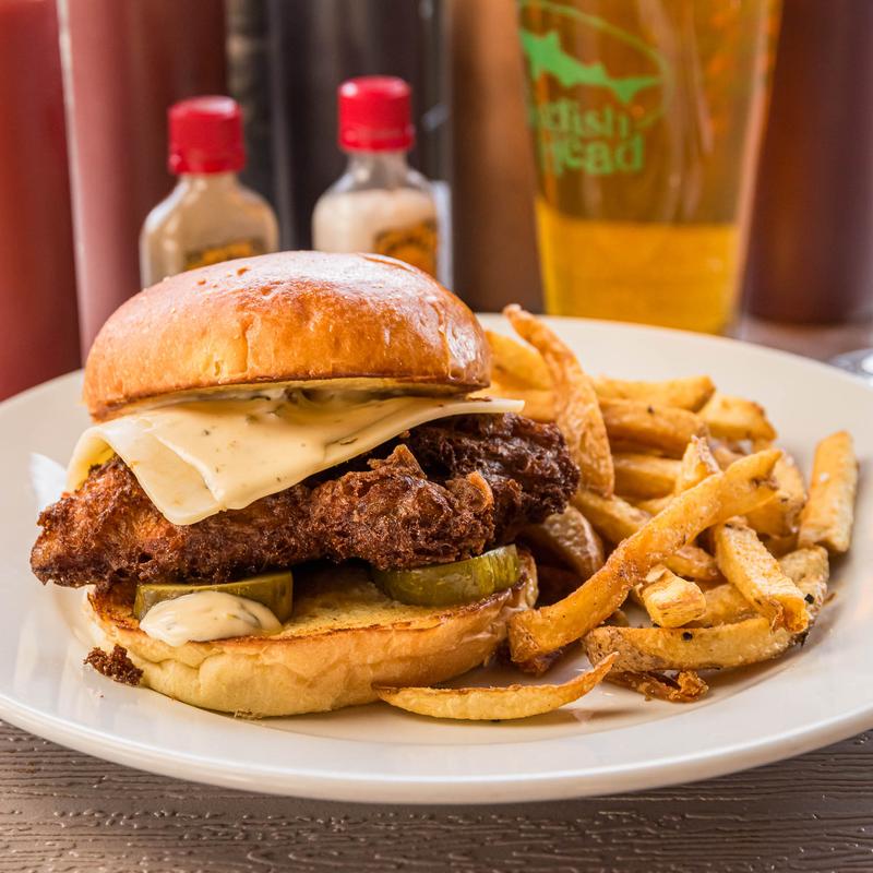 Lightly fried haddock on a brioche bun with lettuce, tomato, and tartar sauce.