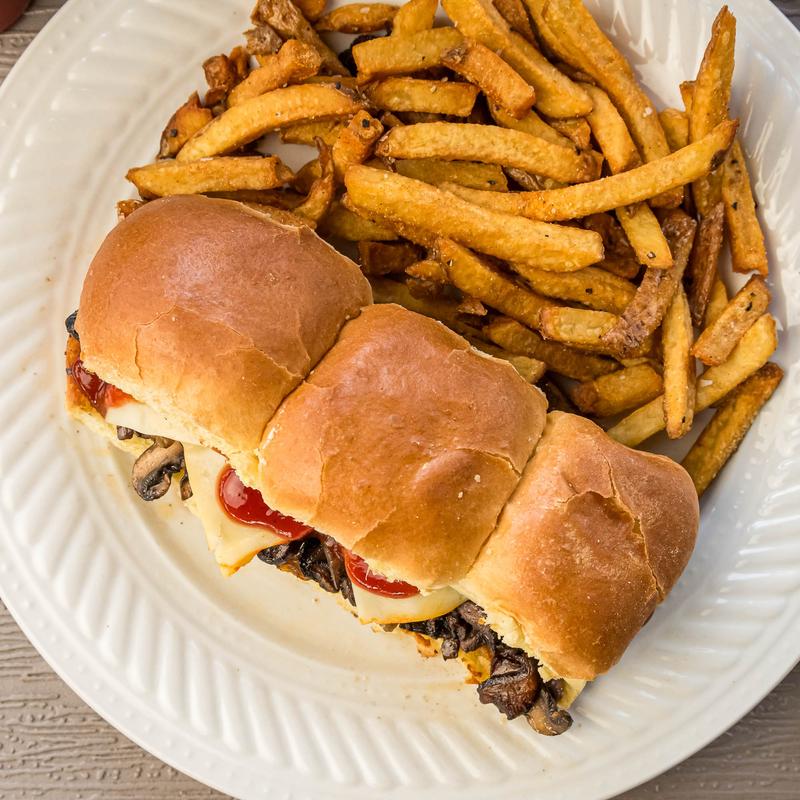 Sauteed mushrooms with house BBQ sauce, Meunster cheese on 3 sliders buns.